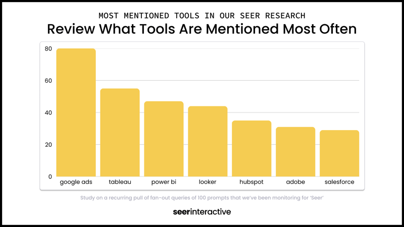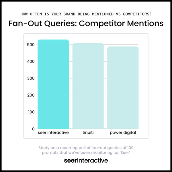 In our query fan-outs, “Seer Interactive” appeared in 530 of 11,029 query fan-outs. The top ‘competitors’ that were mentioned were:
