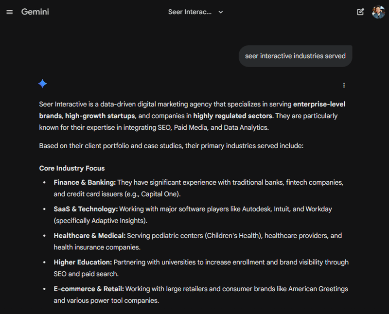 In our data "seer interactive industry awards and recognition" has been searched 17 times by Gemini and "seer interactive industries served" has been searched 13 times.