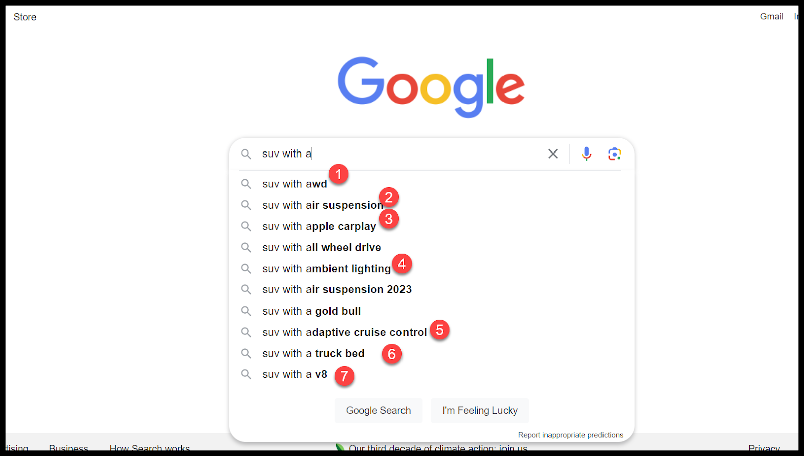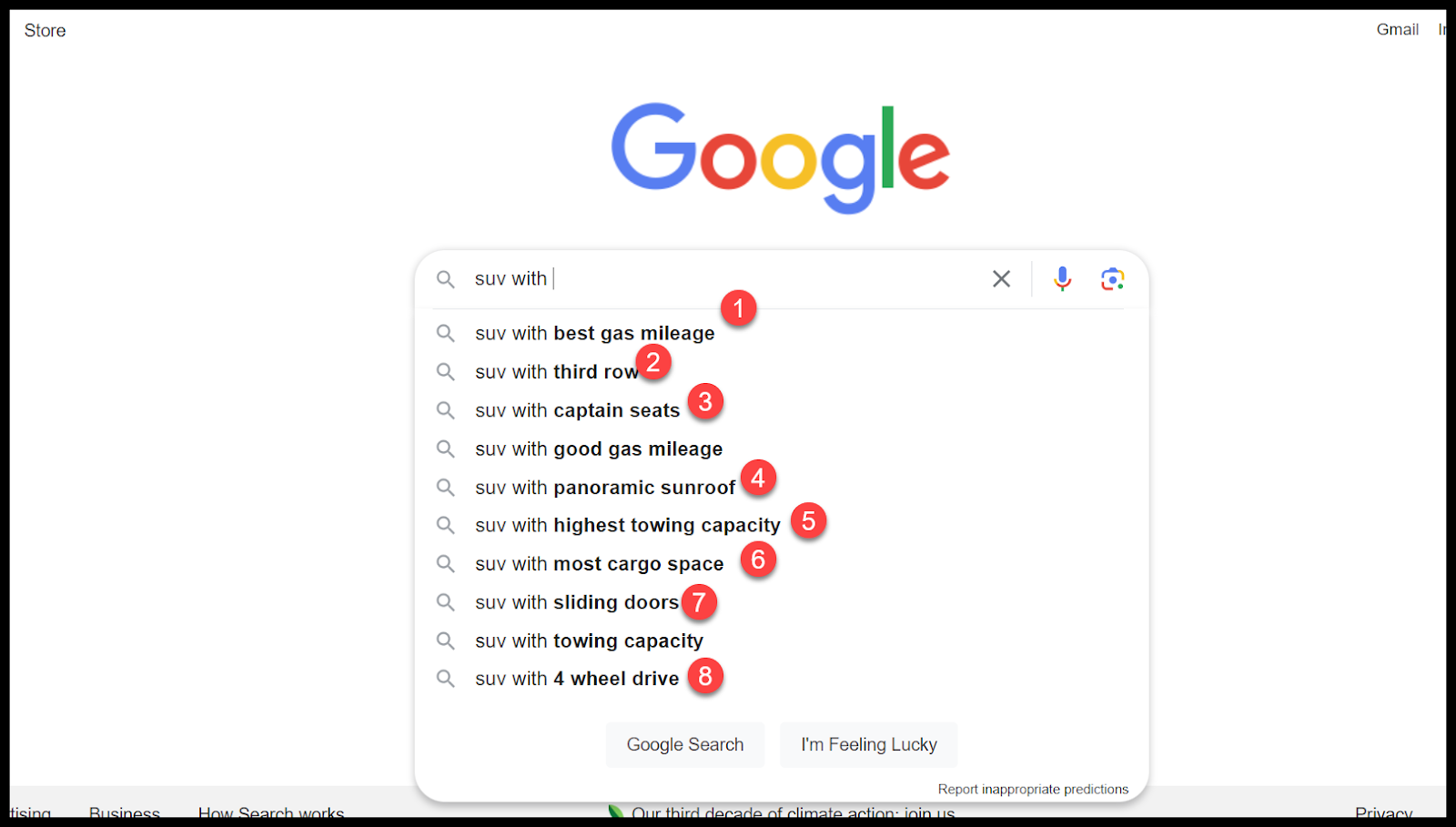 The Google autocomplete shows that people search in a lot of unique ways for a car, and we all have needs unique to our situation, these “with” suggestions give context, but look at all the other “context / role clues left behind, meaning we got some content building work to do, maybe.