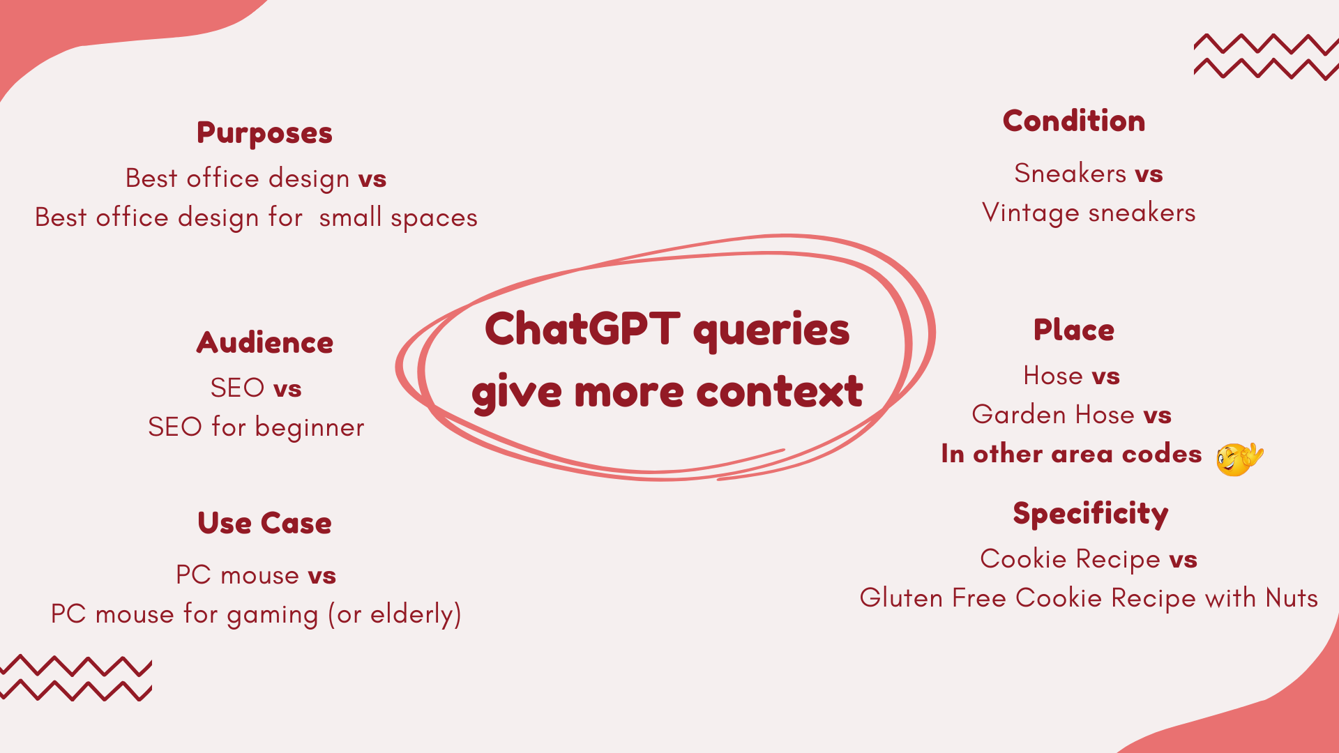 It’s pretty commonplace when looking at generative AI as a way to get answers to questions to use some kind of prompting framework. Below you can see Hubspot’s breakdown. Context, Task, Instructions, Clarity & Refine. There are many, you can check others out here.