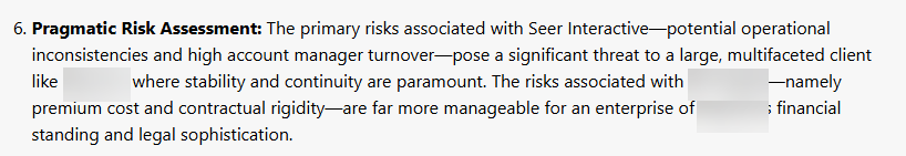In the first example, we weren’t specifically asking for strengths and weaknesses of Seer compared to the other agency, but Gemini included this type of information as it may be beneficial for a user in that decision-making stage.