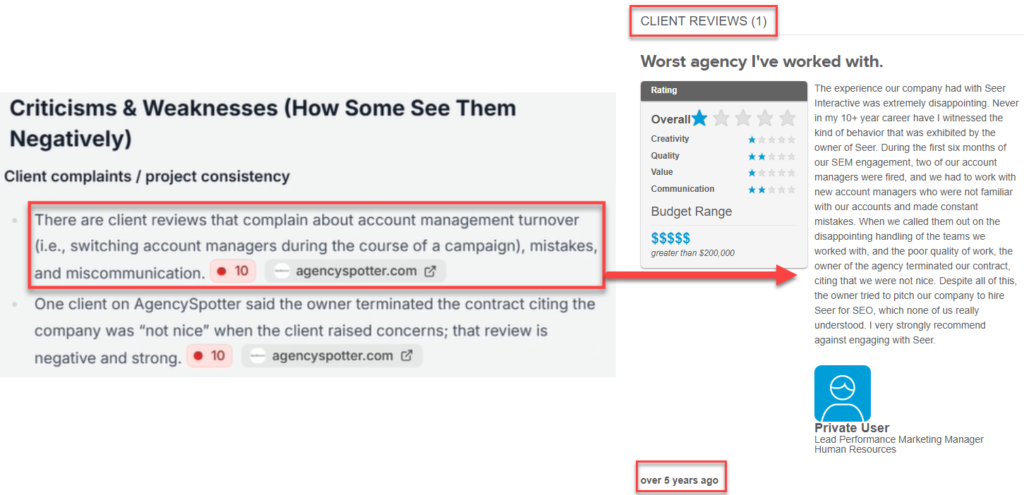 Pages containing that one review show up in 38% of our branded prompts. And on three of the five review sites, including AgencySpotter, that review is the only one listed. But when you see how it’s referenced in an LLM, it reads as though multiple clients raised the same issue.